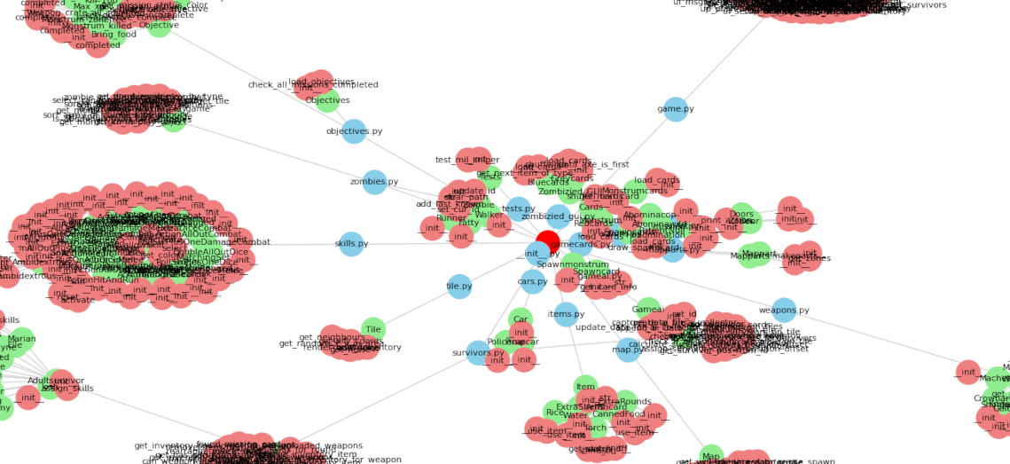 That’s where this knowledge graph comes in. I am turning my codebase into a network. The nodes represent my files, classes and functions. Each edges show how they depend on each other. I could use arrows but the would only require an little edit to the code below – just change G = nx.Graph() to G = nx.DiGraph()