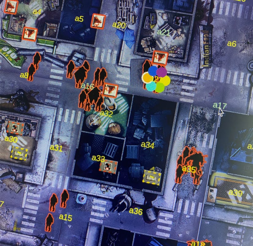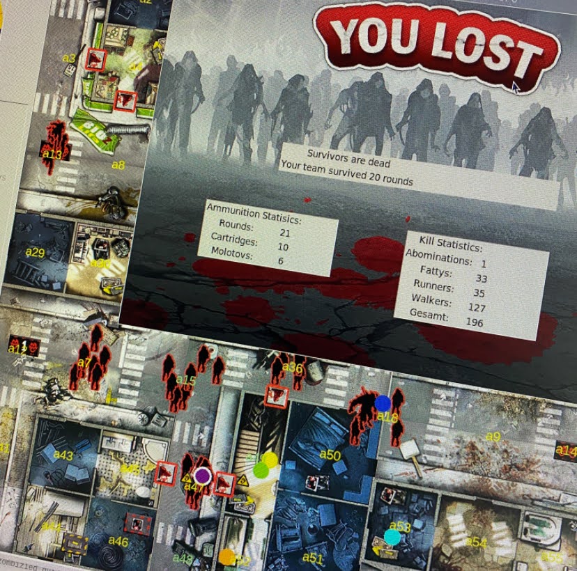 I replaced clicking on the suvivor top icons when a zombie causes damage. When damage is applied, a damage selector tk.frame object shows the survivor icons and this is kept “on top” until a survivor is selected. The function that renders this also calls a function self.survivors.check_if_survivors_are_still_alive which returns either True or False. If False is returned (when a survivor has 0 hp) – the end game splash dialog is called.